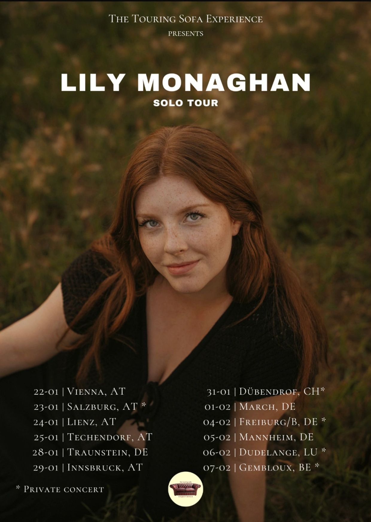 Find Lily performing her repertoire across Europe from January 22nd to Feb 7th, 2026. In partnership with the Touring Sofa, Lily Monaghan is solo with just her keyboard with a mission to create a raw, impactful, intimate, and above all - memorable performance experience.